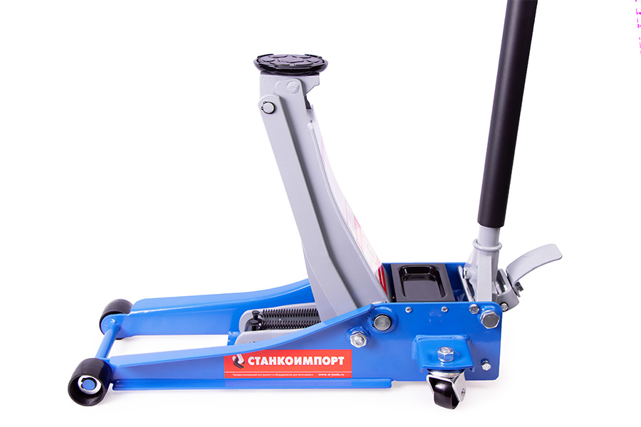 Подкатной гидравлический домкрат имеет ручной привод и предназначен для подъема машины при осуществлении ремонтных работ — к примеру, замены колес. Он отлично подойдет для личного использования на даче, в гараже или для работы на небольшой шиномонтажной станции.