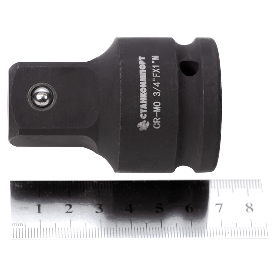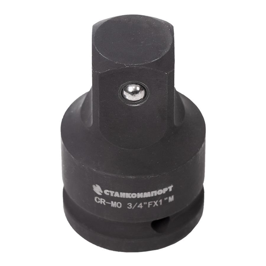 “Мама” адаптера имеет размер 3/4" дюймf, а “папа” - 1" дюйм, что позволяет использовать его с различными типами торцевых головок и инструментов.
