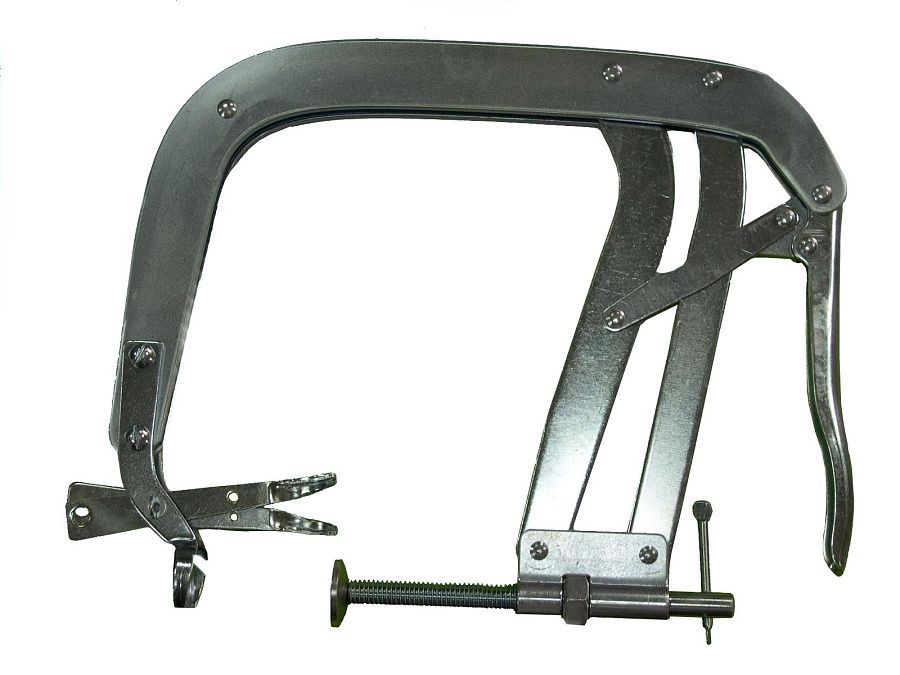 Фиксация струбцины в необходимом положении позволяет освободить руки для удобства демонтажа стопорных сухарей клапана.