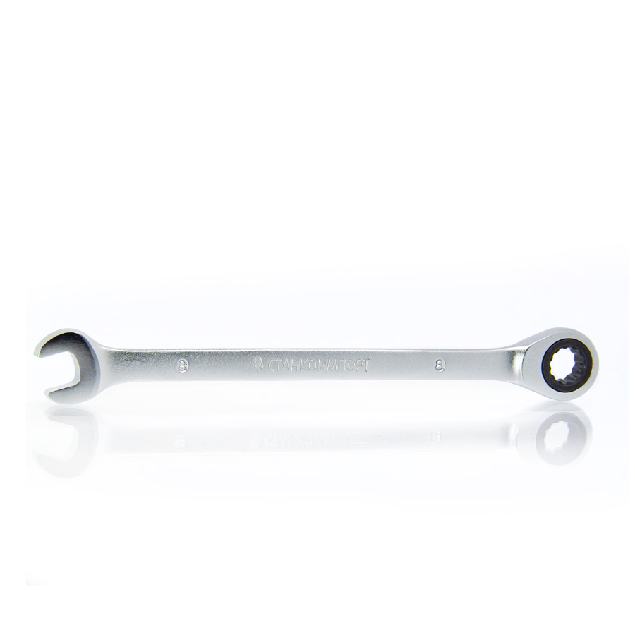 Данный тип ключа является максимально универсальным за счет наличия двух типов рабочих профилей, рожкового и накидного. Каждый из них имеет определенные преимущества. Рожковый – незаменим в тех случаях, когда доступ к крепежу ограничен, но из-за того, что имеет только две точки контакта с крепежом, не способен выдерживать большие крутящие моменты. Накидной – за счет наличия трещоточного механизма незаменим при работе в условиях ограниченного пространства. Механизм имеет 72 зуба, что обеспечивает шаг перехвата в 5 градусов, что существенно облегчает работу. Ключи изготовлены из высококачественной инструментальной стали марки 6140.